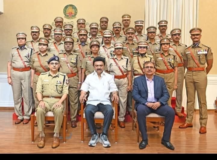 தமிழ்நாடு முதலமைச்சர் மு.க.ஸ்டாலின் அவர்களை தலைமைச் செயலகத்தில், புதிதாக பதவி உயர்வு பெற்றுள்ள இந்திய காவல் பணி அலுவலர்கள் ச.மணி, சு.செல்வகுமார், மருத்துவர் ம. சுதாகர், எஸ்.ஆர். செந்தில் குமார், ஜா. முத்தரசி,கா. பெரோஸ்கான் அப்துல்லா, இரா. சக்திவேல், திருமதி ஜி.நாகஜோதி, மு.இராசராசன், திருமதி.விமலா, து.பெ.சுரேஷ் குமார்,வி.பாஸ்கரன், டி.சண்முக பிரியா, சீ.ஜெயக்குமார், எ.மயில்வாகனன், ஹ.ஜெயலட்சுமி, ப.சுந்தரவடிவேல், கோ. உமையாள், ச.சரவணன், முனைவர் த.செந்தில்குமார், பி.மகேந்திரன், க.சுப்புலட்சுமி, ப.இராஜன், ச.செல்வராஜ், கோ.ஸ்டாலின் ஆகியோர் சந்தித்து வாழ்த்து பெற்று, குழு புகைப்படம் எடுத்துக்கொண்டனர். உடன், உள்துறை கூடுதல் தலைமைச் செயலாளர் தீரஜ் குமார், காவல் துறை தலைமை இயக்குநர் சங்கர் ஜிவால், இ.கா.ப. உள்ளனர்