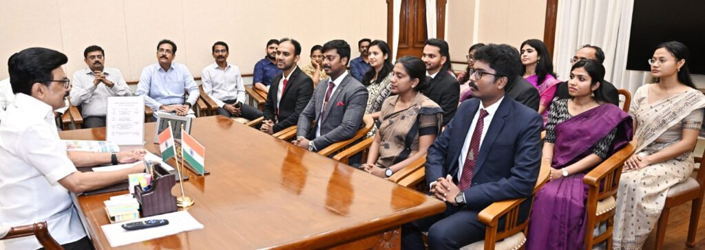 தமிழ்நாடு முதலமைச்சர் மு.க. ஸ்டாலின் அவர்களை தலைமைச் செயலகத்தில், அகில இந்திய குடிமைப் பணித் தேர்வில் வெற்றி பெற்று, பயிற்சி பெற வந்துள்ள துள்ள தமிழ்நாட்டிற்கான இந்திய ஆட்சிப் பணி அலுவலர்கள் டி. புவனேஸ்வரன், டாக்டர் சி. விநோதினி, டாக்டர் எஸ். பிரசாந்த், டாக்டர் எம். சுபதர்ஷினி, ஆர். வெங்கடேஸ்வரன், அம்ருதா எஸ். குமார், டி, மாலதி, கே.எம். கார்த்திக் ராஜா, விவேக் யாதவ், காஞ்சன் சவுத்திரி, கிருத்தி காம்னா, ராகுல் குமார், சேத்ரிமாயும் தீபி சானு ஆகியோர் சந்தித்து வாழ்த்து பெற்றனர். உடன் தலைமைச் செயலாளர் நா.முருகானந்தம், நிதித்துறை முதன்மைச் செயலாளர் த. உதயச்சந்திரன், மனிதவள மேலாண்மைத் துறை முதன்மைச் செயலாளர் கோ. பிரகாஷ், மற்றும் அரசு உயர் அலுவலர்கள் உள்ளனர்.