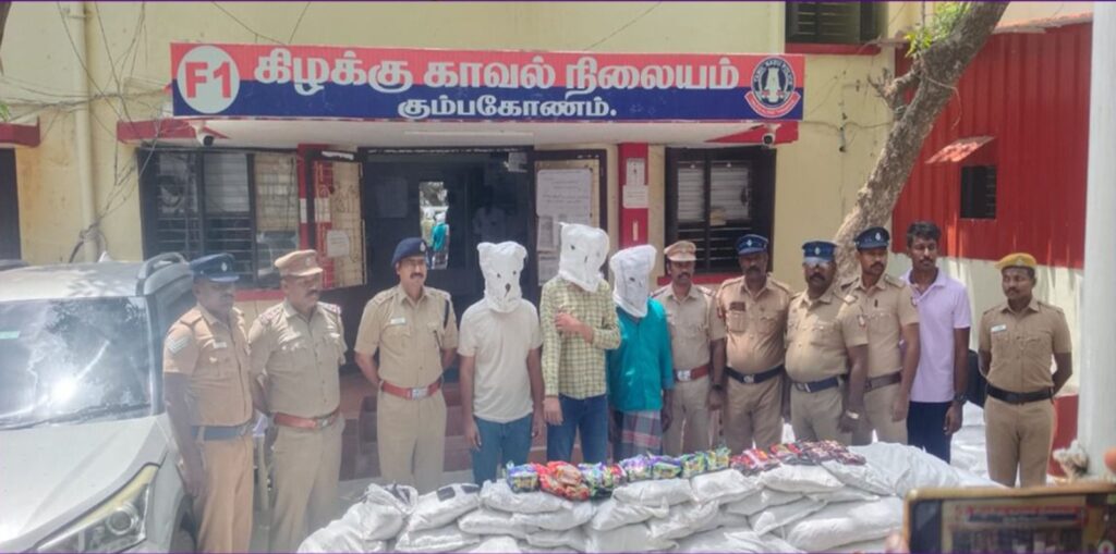 தஞ்சாவூர் மாவட்ட காவல் கண்காணிப்பாளர் உத்தரவின் படி அனைத்து உட்கோட்ட காவல் பகுதிகளிலும் போதைப்பொருட்களுக்கு எதிராக சோதனை மேற்கொள்ளப்பட்டு வருகிறது. இதில் 24.04.25 – ம் தேதி கும்பகோணம் உட்கோட்டம் கிழக்கு காவல் நிலைய ஆய்வாளர் சிவசெந்தில் குமார் மேற்பார்வையில் காவல் உதவி ஆய்வாளர் சுபாஷ் தலைமையிலான காவலர்கள் அடங்கிய குழுவினரால் தீவிர சோதனை மேற்கொண்டதில் மேலக்காவேரி அருகே சந்தேகத்திற்குட்பட்ட நான்கு சாக்கர வாகனத்தை சோதனை செய்ததில் 550 கிலோ குட்கா, 3 தொலைபேசிகள் மற்றும் நான்கு சக்கர வாகனம் ஆகியவை பறிமுதல் செய்து குற்றவாளிகளான 1. சென்னை, வியாசர் பாடியை சோர்ந்த ரோனக் சிங், 2. ராஜஸ்தான் மாநிலம், பாலி மாவட்டத்தைச் சேர்ந்த மன்மோகித் மற்றும் 3.தஞ்சாவூர் மாவட்டம் கும்பகோணம் அரியாத்திடலைச் சேர்ந்த பிரகாஷ் ஆகியோர் கைது செய்யப்பட்டு சட்ட ரீதியான நடவடிக்கை மேற்கொள்ளப்பட்டது